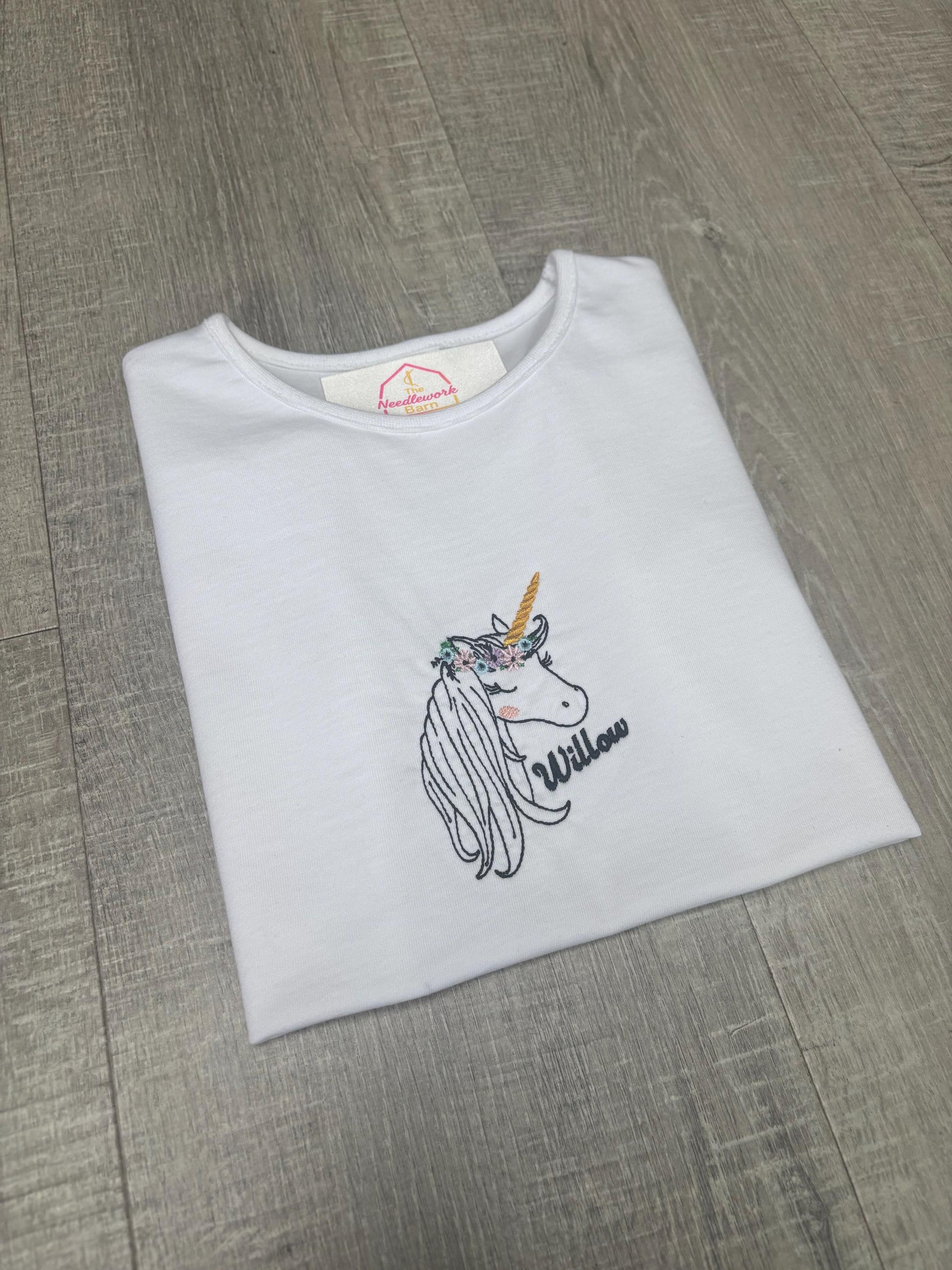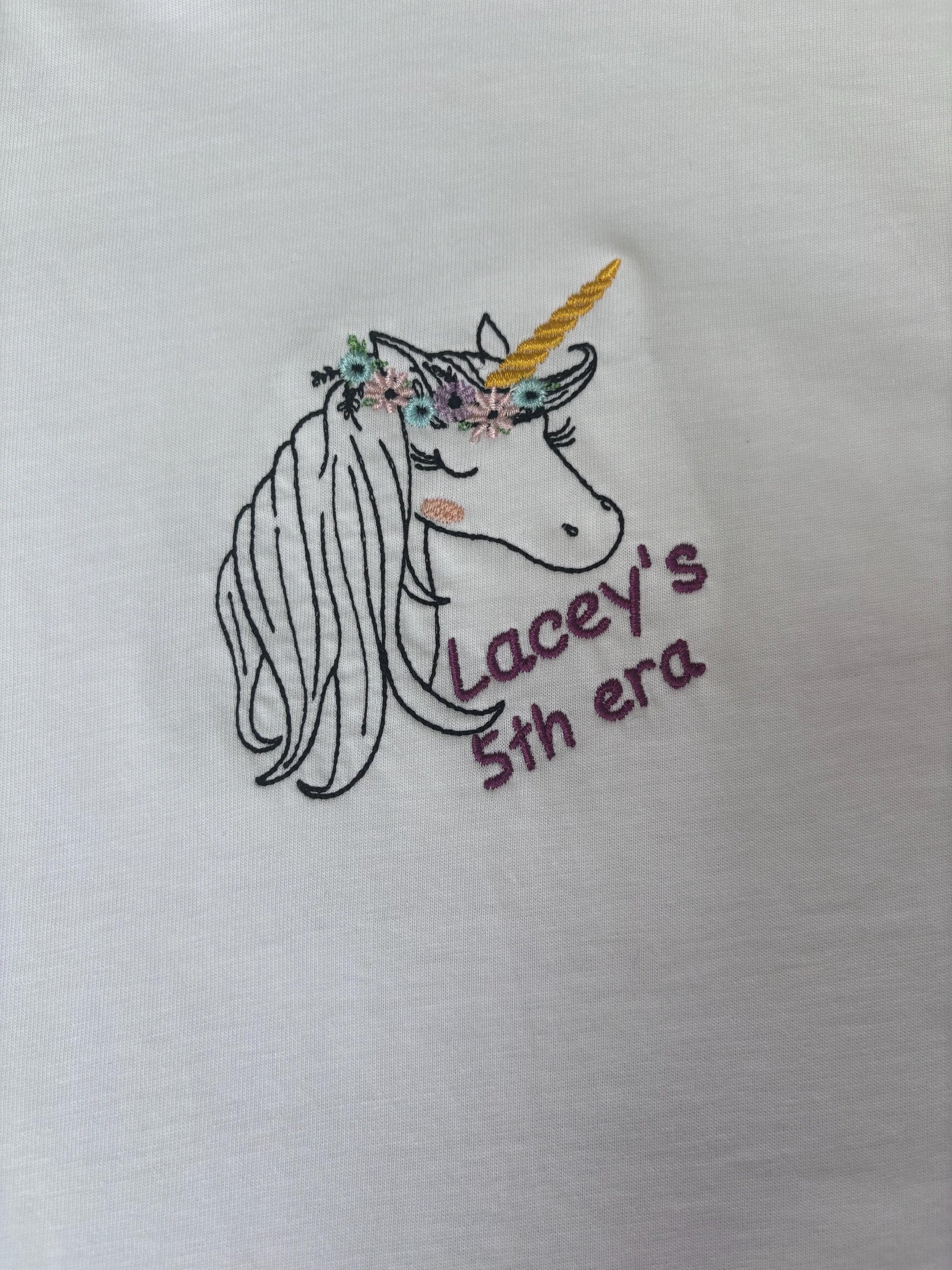 Each tee features a beautifully embroidered unicorn design at the top centre of the chest, complete with your child’s name and age stitched in high-quality thread.