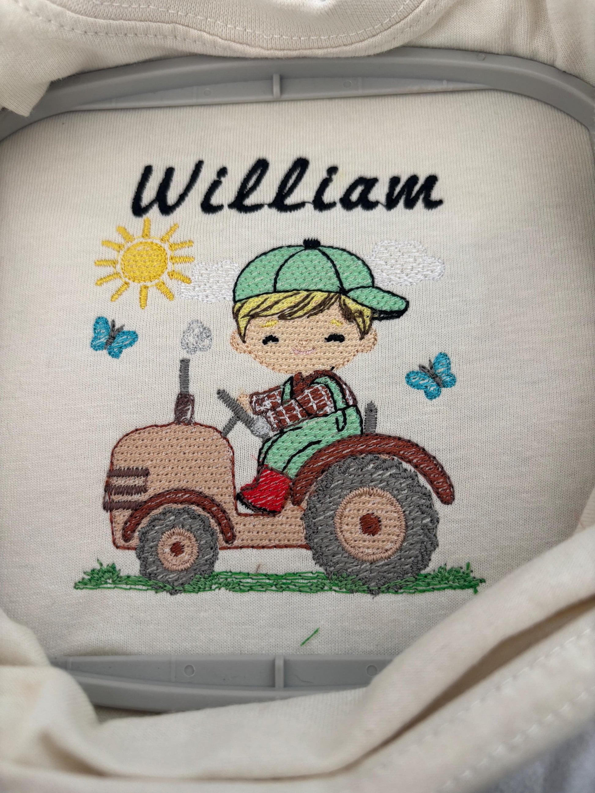 Looking for a unique and eco-friendly gift for a little one? Our adorable personalised toddler T-shirt features a cute embroidered tractor design, stitched on the top centre of the chest with your chosen name.